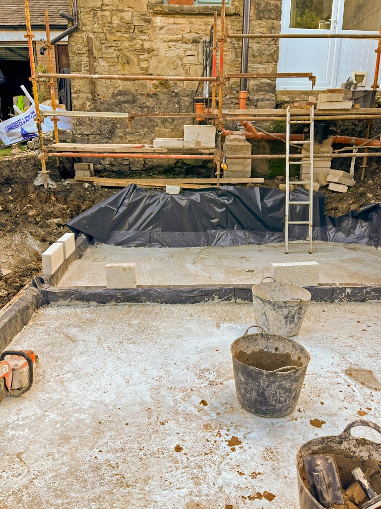 Concrete slab laid, I was able to commence working on the ‘tanking’ of the extension required due to its proximity of the neighbours garden and external building.